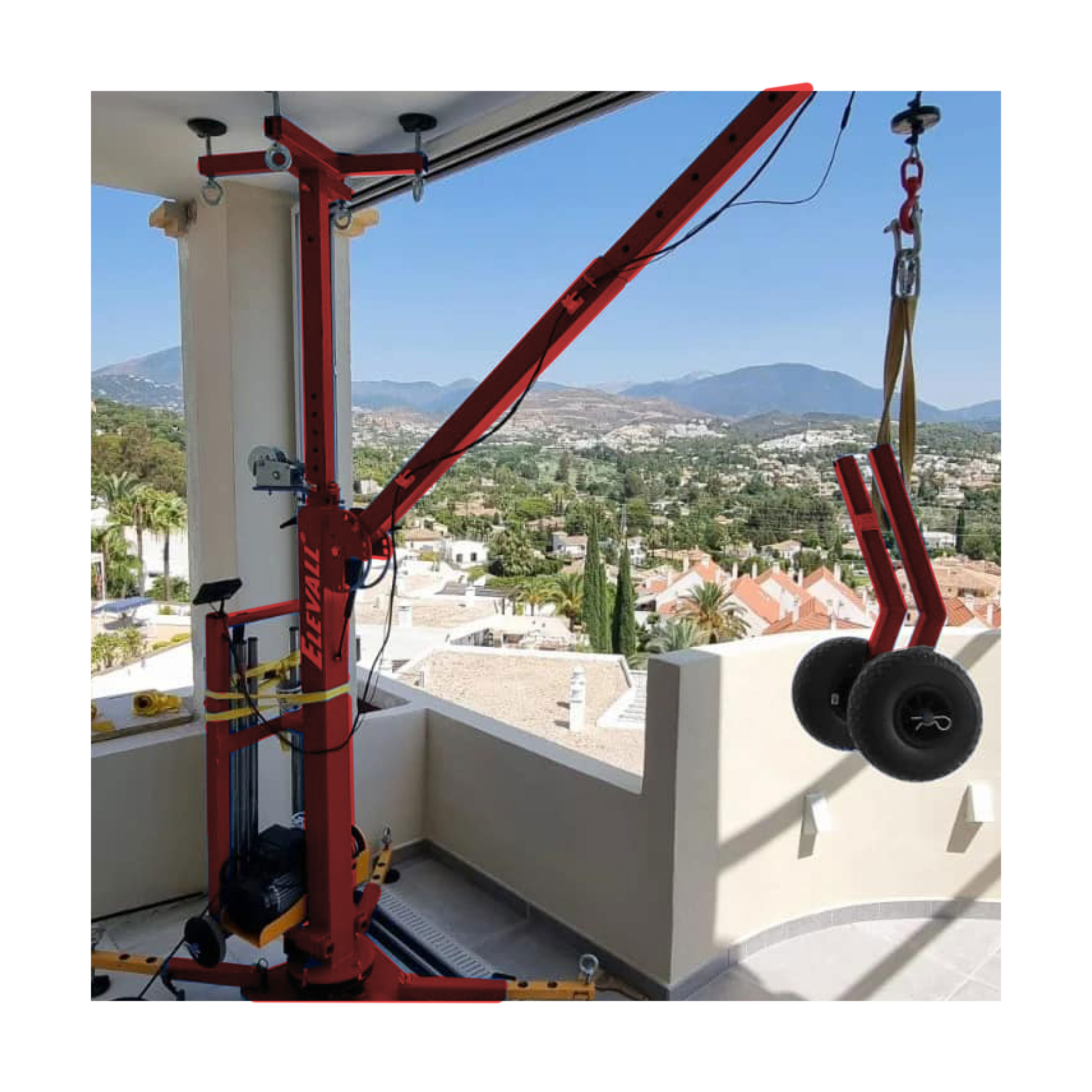 Balkonkrane wurden speziell für den Transport über Etagen konzipiert. Der Balkonkran kann also zwischen den Etagen eingespannt werden ODER alternativ mit Beinen und Gegengewichten aufgestellt werden. Der Elevall Balkonkran ist universell einsetzbar! Der leicht verfahrbare Balkonkran ist ideal für Renovierungen, Gebäudeausbau und in Bereichen, die nicht mit einem Aufzug oder einem Kran erreicht werden können.