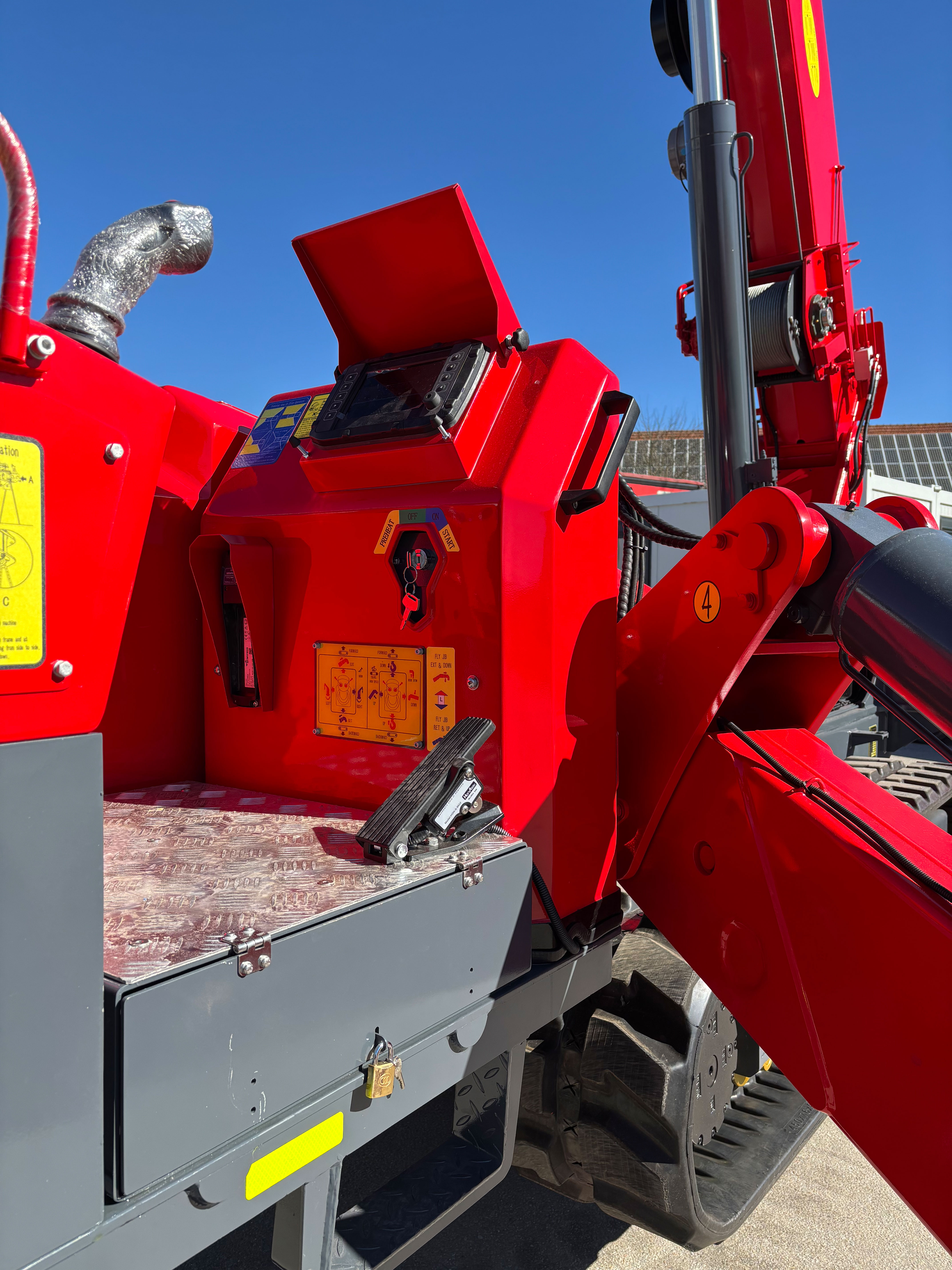Montagespitze, Lasthaken, Motorheizung, Hybridantrieb, Funkfernbedienung mit integrierter digitaler Lastanzeige, Betriebsstundenzähler, 1/2/4-fach-Hakenflasche, schwarze Gummiketten, 360° Schwenkbereich, Überdrehungsschutz, hydraulische Sicherheitsventile, Nivellierungsanzeige, Kippalarm, Not-Ausschalter, Lastmomentbegrenzer, Betriebswarnleuchte, Arretierung der Stützfüße, Toolbox