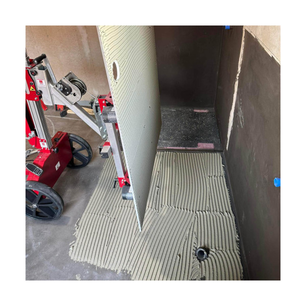 Für Großformat-Fliesen mit über 400 kg Gewicht, hat Uplifter Geräte mit Elektroantrieb entwickelt, die – je nach Gewichtsklasse – hydraulisch oder elektrisch betrieben werden. Besonders praktisch ist die Steuerung der Montagegeräte über eine Funkfernbedienung. So hat der Monteur immer die beste Sicht auf die zu verlegenden Elemente und kann sich frei auf der Baustelle bewegen.