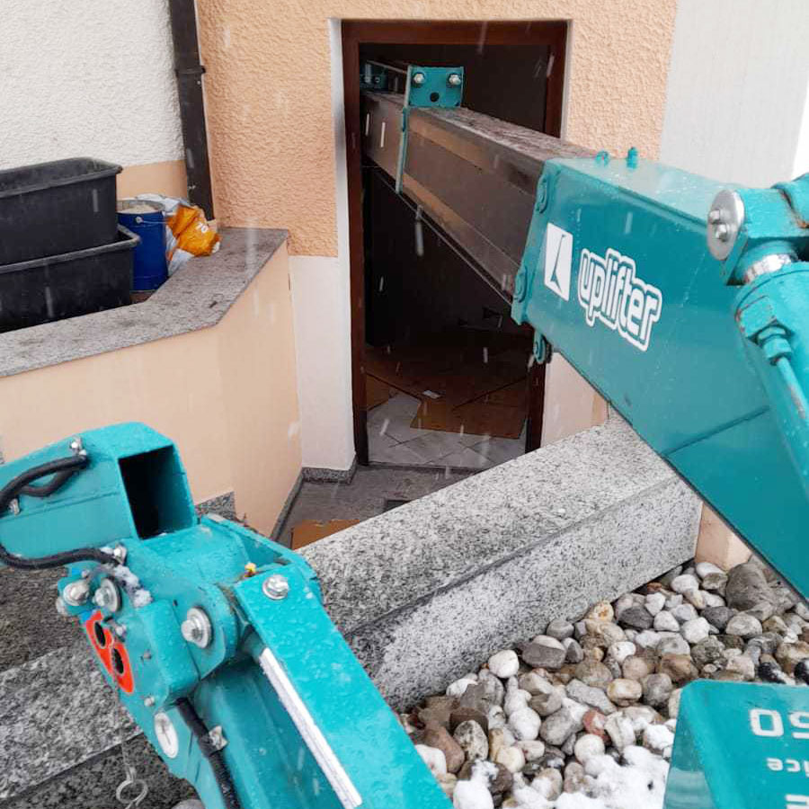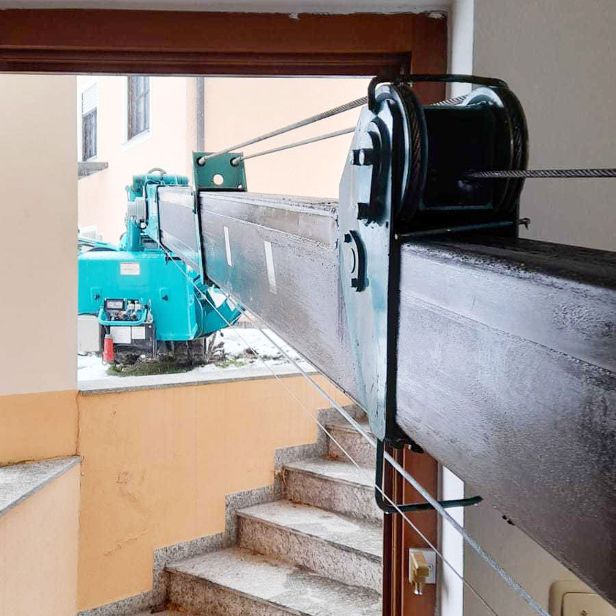 Montage mit Minikran in Cham, Chamerau, Zandt, Rötz, Neunburg vorm Wald, Bad Kötzting, Furth im Wald, Waldmünchen oder Roding! Mit einem Minikran können – wie bei diesem Einsatz im Landkreis Cham – Lasten sicher durch Türen und Fenster gehoben werden. Auch das Verheben in Kellerräume auf engstem Raum ist machbar. Das nötige Geschick und die langjährige Erfahrung bringen unsere Kranführer selbstverständlich mit.