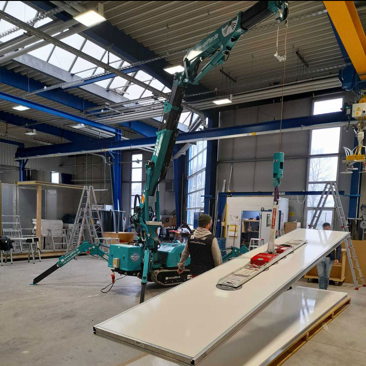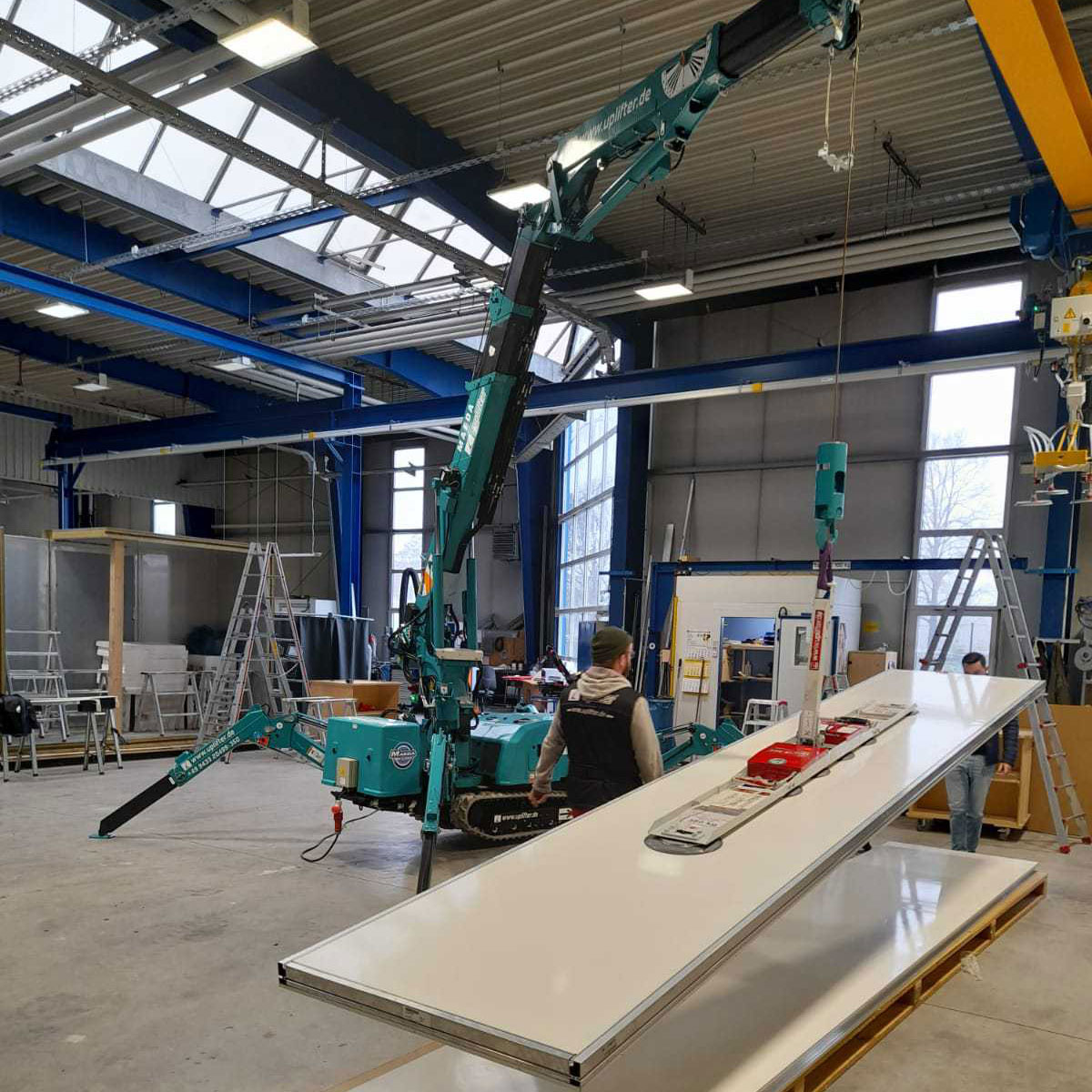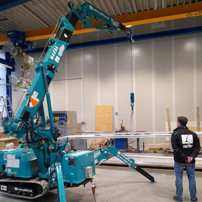 Minikran Maeda MK1033 durfte in den Industriehallen eines bekannten Isoliertechnikunternehmens zusammen mit dem Vakuumsauger UPG450 sein ganzes Können beweisen. Dank des praktischen Knickarms kann dieser Kran selbst bei extrem niedriger Raumhöhe mit Bestleistung arbeiten. Eine Tragkraft von bis zu 995 kg stellt für diesen Raupenkran keinerlei Hindernis dar. Im Elektrobetrieb punktet dieser Spinnenkran mit 0% Emissionen und kann bedenkenlos auch in geschlossenen Räumlichkeiten betrieben werden. TOP! Lästige Reifenspuren auf Industriebeton und Hallenboden gehören der Vergangenheit an – einfach die weißen NON-MARKING-Raupenketten für Inneneinsätze mitbestellen!