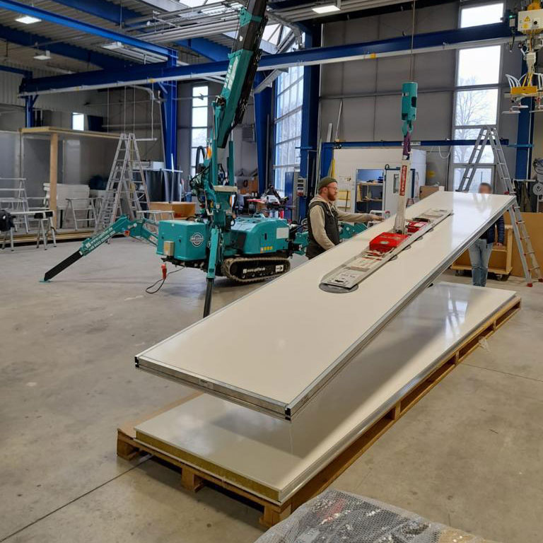 In Verbindung mit dem schlanken UPG450, ein Vakuumsauger, der speziell für lange, schmale Elemente konzipiert wurde, ist das Ansaugen von Platten, Glas oder anderen empfindlichen Materialien ab sofort ein Kinderspiel. Ein wahrer Spezialist auf seinem Gebiet. Der Vakuumsauger UPG450 überzeugte bei dieser Live-Vorführung voll und ganz beim Ansaugen von verschiedenen Dämmplatten, Sandwichplatten und Kühlzellensystemen.