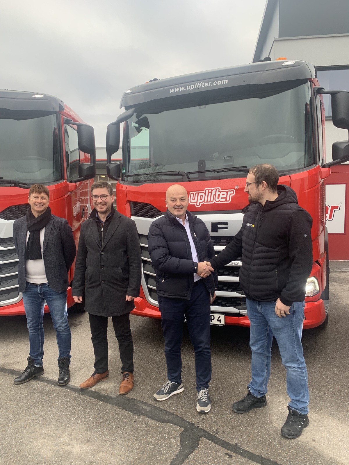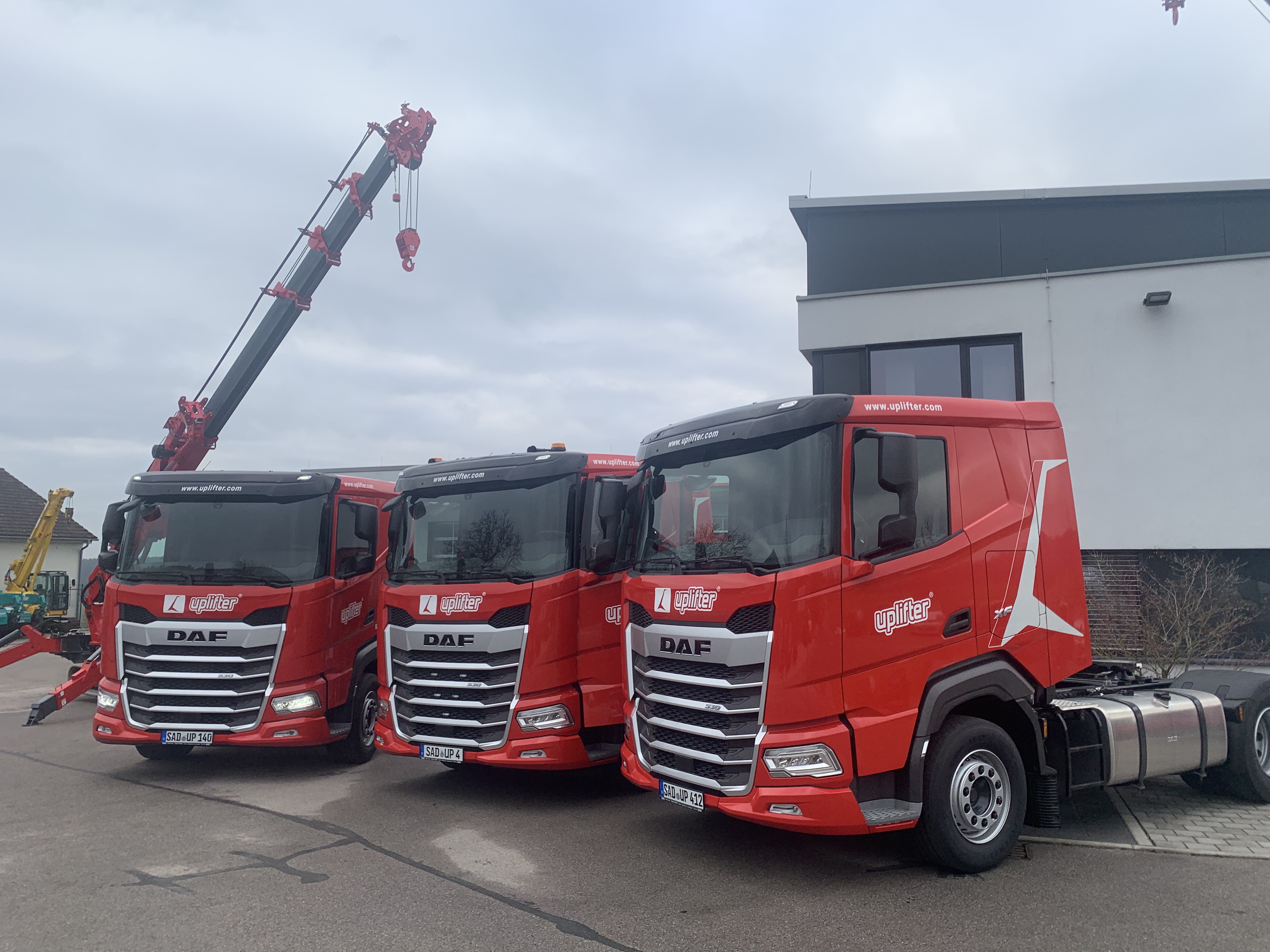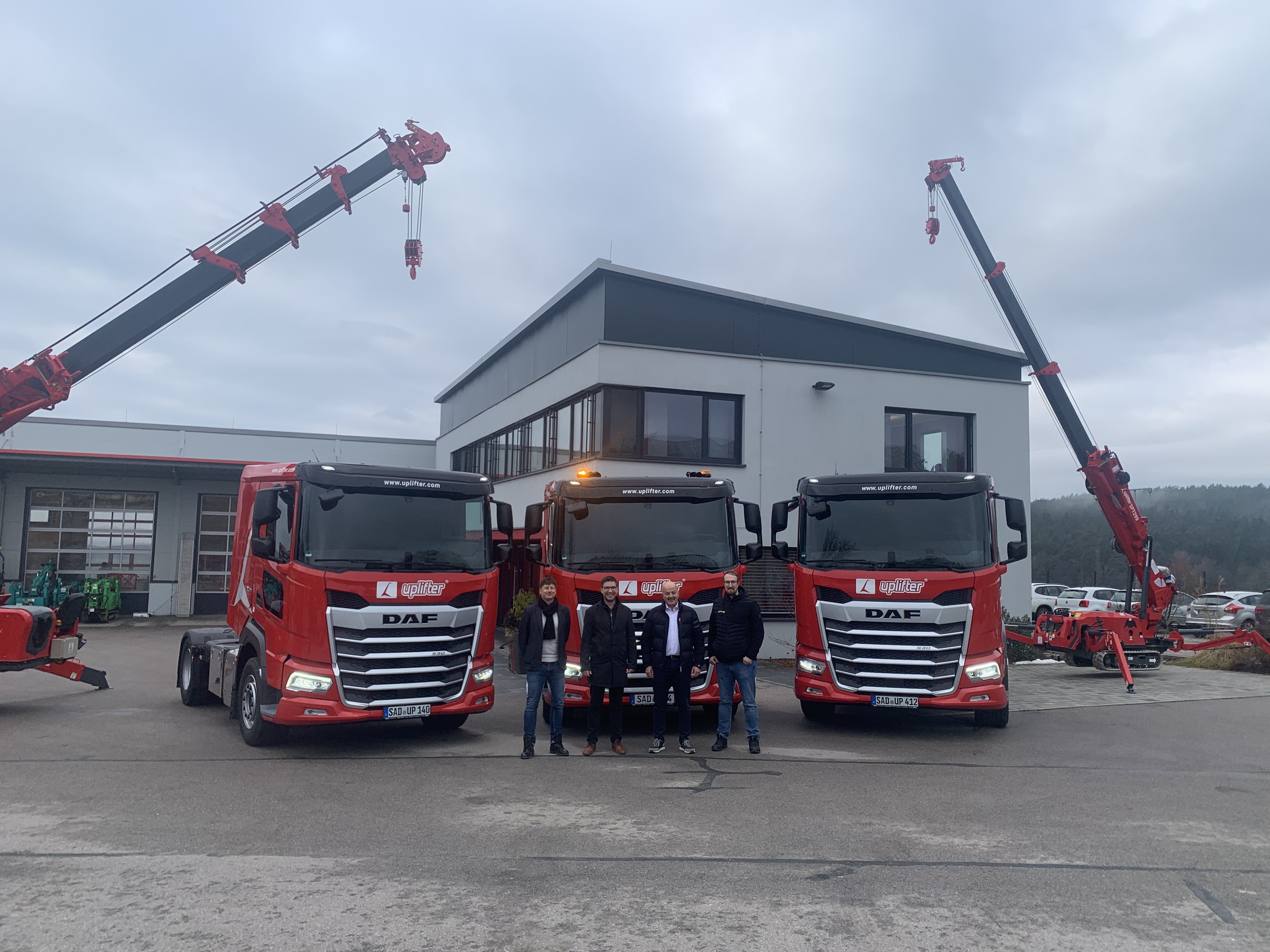 Drei brandneue DAF Sattelzugmaschinen wurden pünktlich vor Weihnachten durch das Traditionsunternehmen Göppl aus Weiden in der Oberpfalz in die Uplifter Zentrale geliefert. Beratung und Verkauf der über 530 PS starken Sattelzugmaschinen übernahm Florian Zeitler (Verkäufer Nutzfahrzeuge Göppl Group) in Abstimmung mit Uplifter Vermietungsleiter Daniel Zechmann und seinen Lkw-Fahrern, die für Uplifter deutschlandweit zahlreiche Mieteinsätze mit Minikran, Glassworker und Co. bestreiten. “Durch die moderne Ausstattung der Fahrzeuge optimieren wir unsere Ökoeffizienz, das integrierte Spurwechsel-Warnsystem, ein Fahrerassistenzsystem und die Fahrzeugstabilitätsregelung steigern die Verkehrs- und damit auch die Sicherheit für unsere Fahrer.”, betont Vermietungsleiter Daniel Zechmann. Ganz neu ist auch das Sicherheitssystem, das den Fahrer auf ein sich bewegendes Objekt an der Beifahrerseite des Fahrzeugs aufmerksam macht, optimalen Blick verschafft ein zusätzliches Fenster im unteren Bereich der Beifahrertüre.