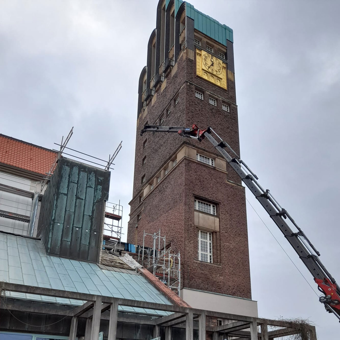 Live von der Baustelle: Maschinist und Kranbediener Timo ist direkt vor Ort auf der Mathildenhöhe Darmstadt, die bereits zum UNESCO-Welterbe erklärt wurde. Bei diesem Einsatz vertraute man ganz auf die Vakuumtechnik von Uplifter. Mit dem schlanken Scheibensauger UPG450 konnten alle Scheiben sicher versetzt werden.