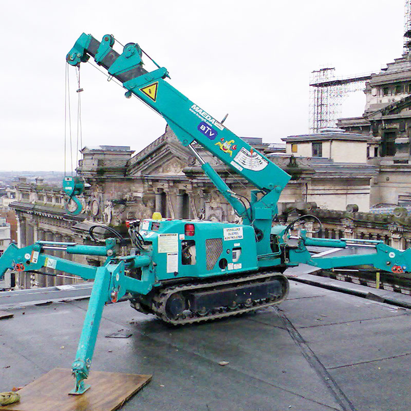 Der derzeit am häufigsten eingesetzte Mini-Bauraumkran auf dem Baumarkt ist der Maeda MC 285 aus Japan. Seine Beliebtheit verdankt er seinen geringen Abmessungen und der niedrigen Bodenpressung, wodurch er auch an Orten mit speziellen Anforderungen eingesetzt werden kann. Der Maeda MC 285 ist mit zwei Motoren ausgestattet – einem Elektromotor und einem Dieselmotor –, was ihn sowohl für den Innen- als auch den Außenbereich geeignet macht, ohne Lärm oder Schadstoffemissionen zu verursachen. Er eignet sich hervorragend für die Montage großformatiger, schwerer Verglasungen, wie z. B. Hebe-Schiebe-Systeme (HS). Dank seiner einfachen Bedienung und kompakten Größe kann dieser kleine Baukran sicher auf Decken, in Garagen und engen Durchgängen betrieben werden.