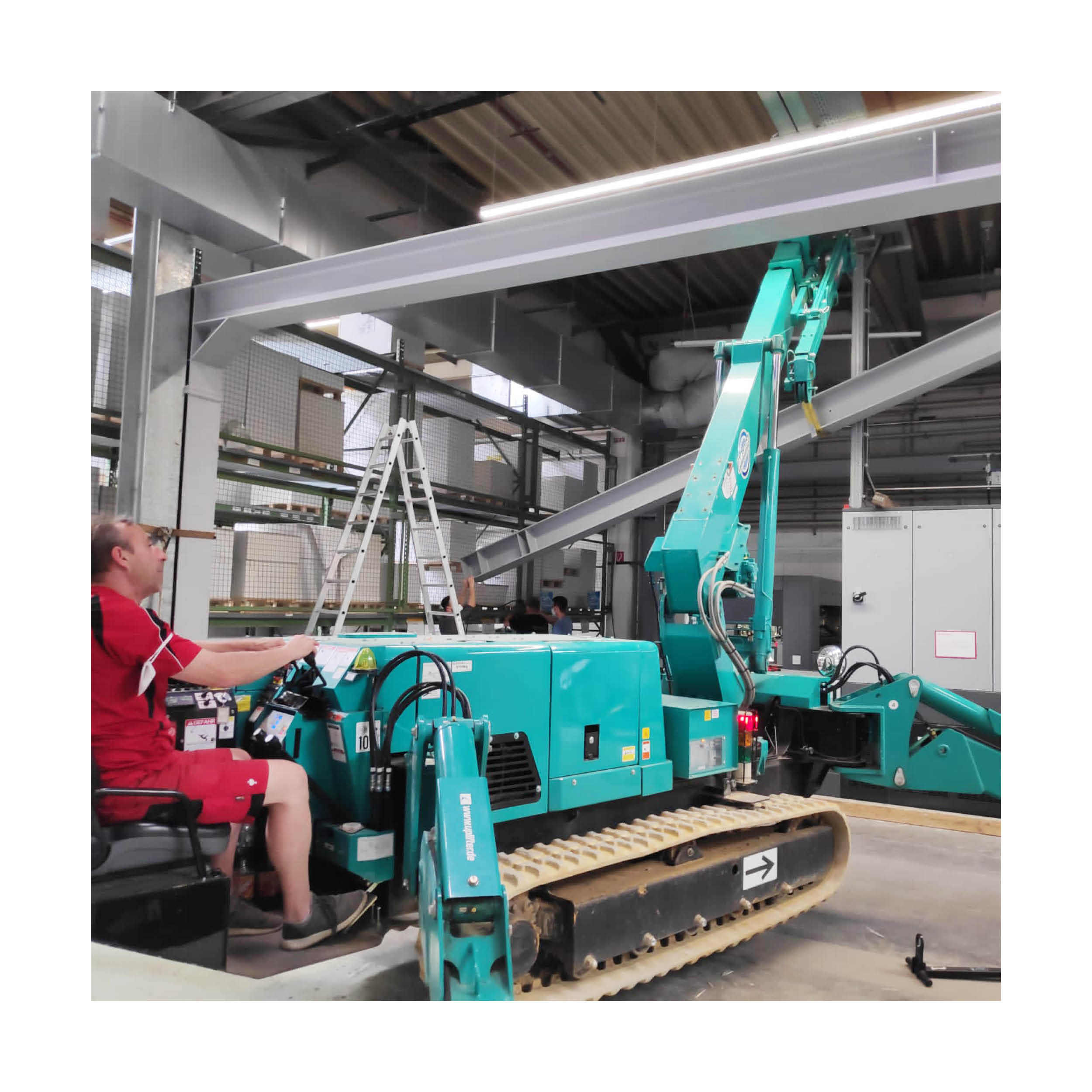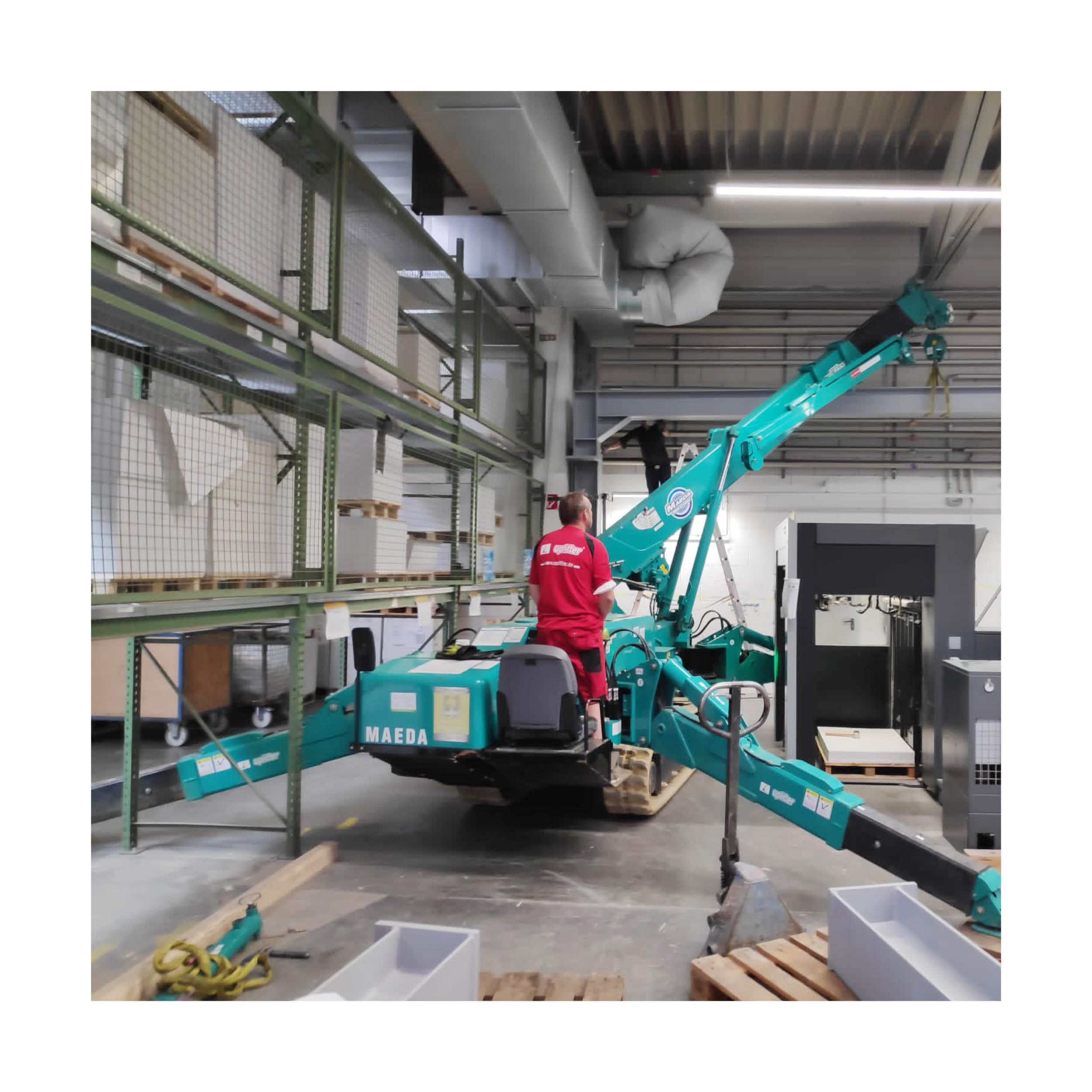 Der Antrieb kann wahlweise mit Diesel oder elektrisch mit Kabel (380 V / 4 Phasen) erfolgen. Somit ist der MAEDA MC405 nicht nur für Innenarbeiten auf empfindlichen Böden prädestiniert, sondern durch sein kraftvolles Raupenfahrwerk auch besonders geländegängig. Der Montagekran verfügt in jeder Auslage über ausreichend Leistung, um Material und Werkzeug sicher zu heben und zu befördern. Durch seine feinfühlige und exakte Steuerung lässt sich der Kran von jedermann einfach und intuitiv bedienen.
