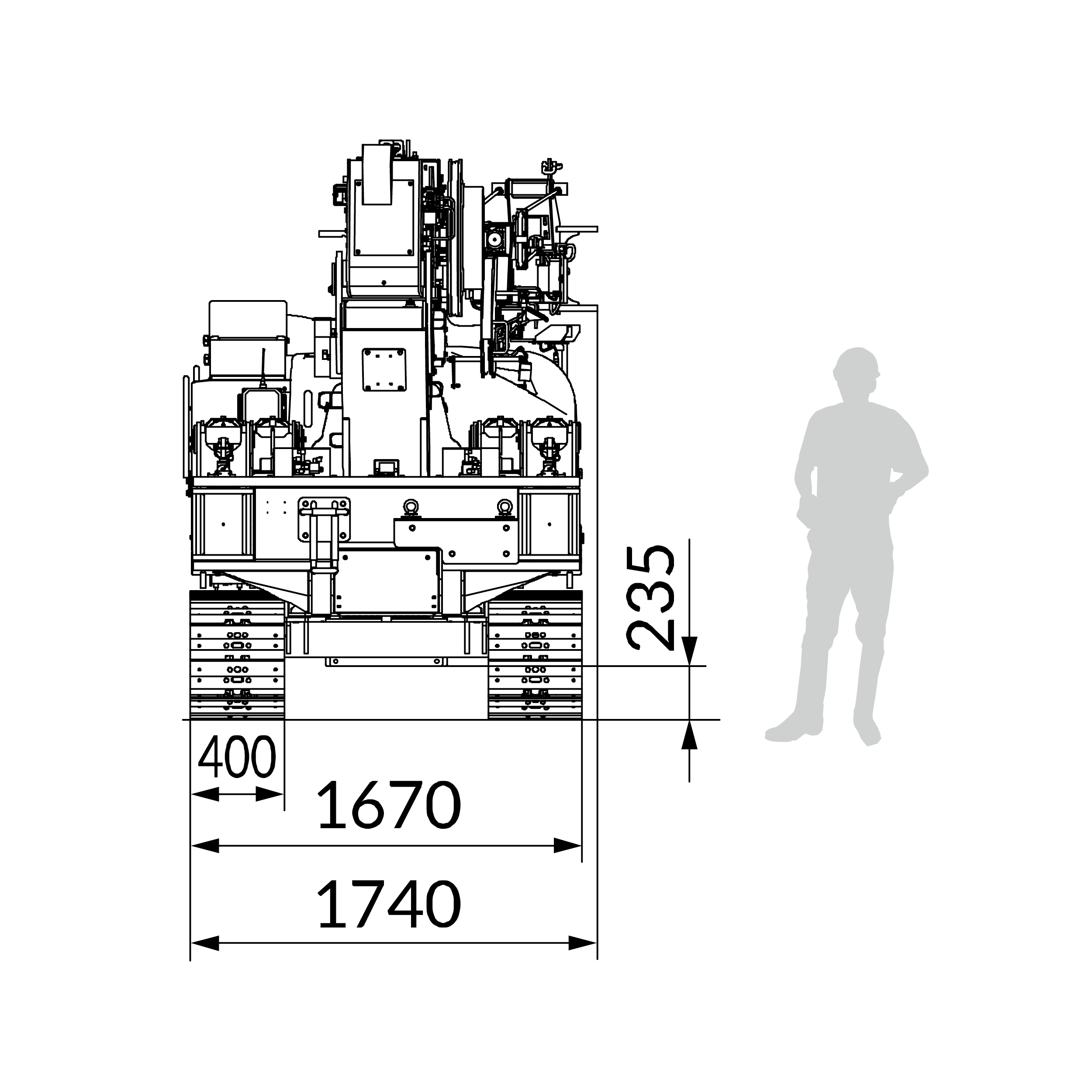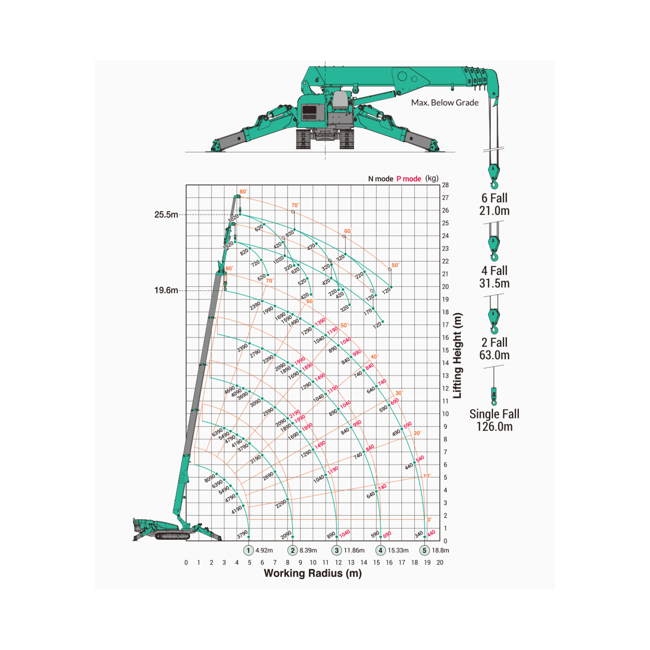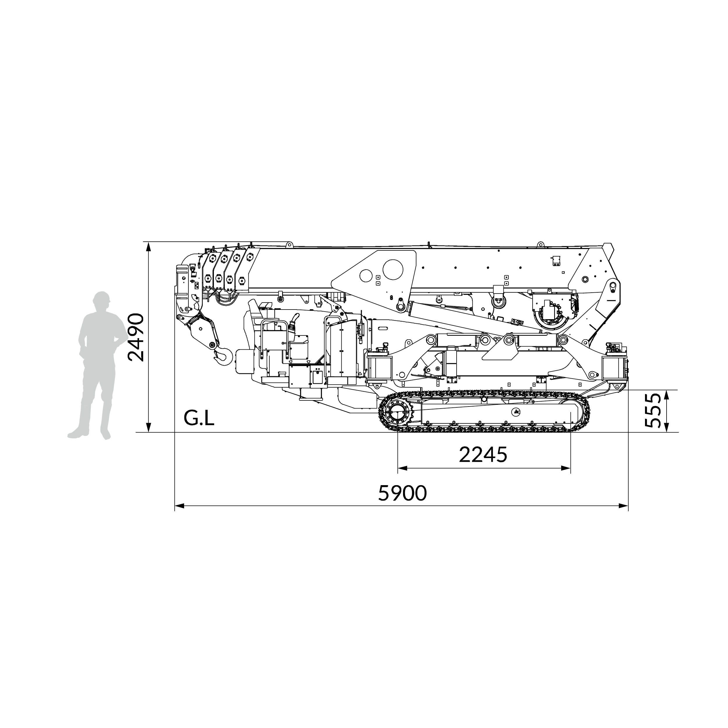 Funkfernsteuerung mit integrierter digitaler Lastanzeige, Joystick-Steuerung, Betriebsstundenzähler, 6-fach Hakenflasche, Raupenketten aus Metall, Überdrehungsschutz, hydraulische Sicherheitsventile, Drahtseilverriegelung, Nivellierungsanzeige, Kippalarm, Not-Ausschalter, Verriegelungssicherung der Abstützungen, Lastmomentbegrenzer, Betriebswarnleuchte, Drehbegrenzung, Datenlogger, Vorder- und Seitenkamera, variable Abstützung, Arbeitsscheinwerfer