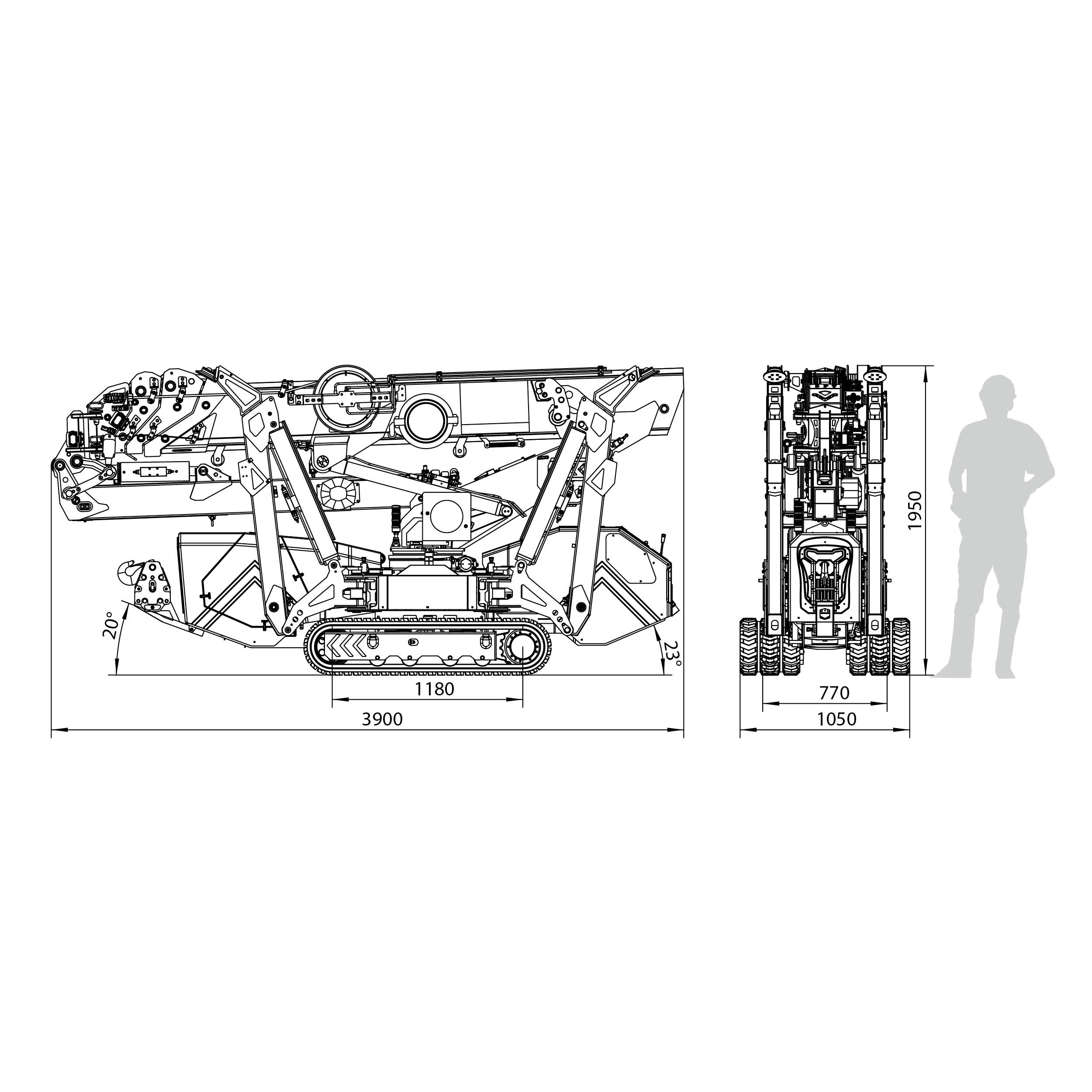 - L/B/H 3.900 mm x 770 mm (bis 1.050 mm) x 1.950 mm (inkl. FlyJib)
