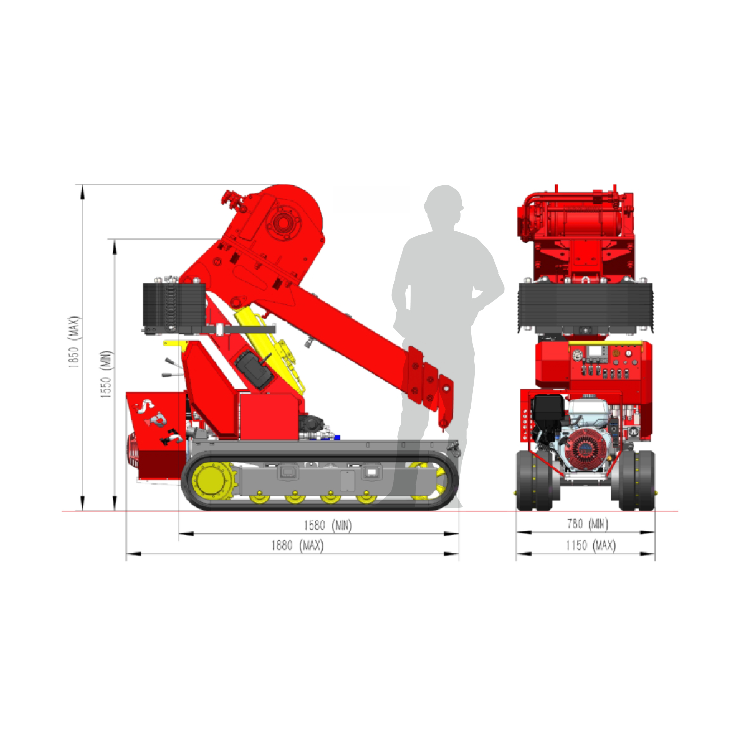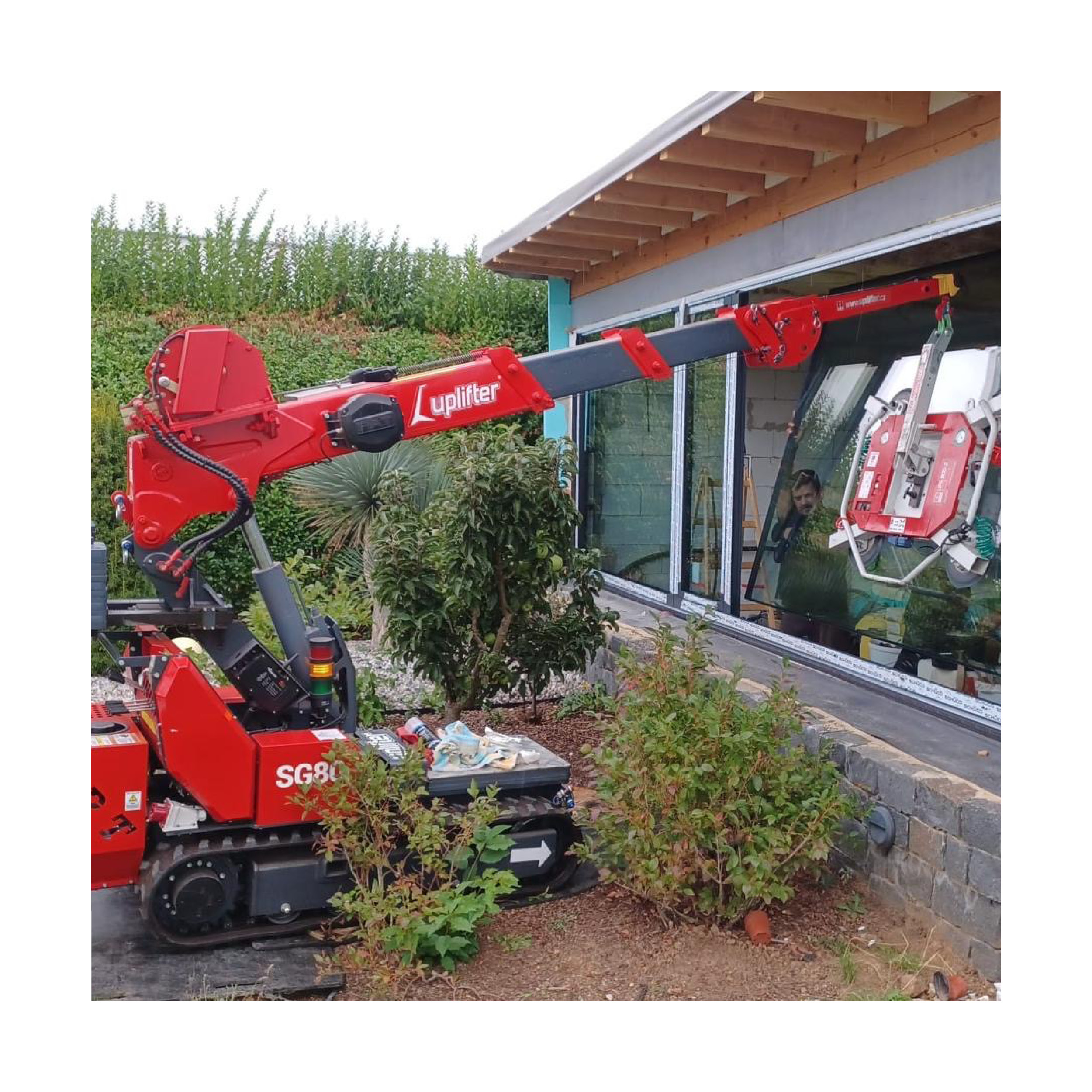 Der SG80 ist ein universeller Begleiter, egal ob Verglasung oder Kranen bis zu 800 kg. Er meistert seine Aufgaben auch in schwierigem Gelände. Sein verbreiterbares Raupenfahrwerk ermöglicht die Durchfahrt von Türen im Innenbereich. Der Standard-Hybridantrieb macht auch das emissionsfreie Arbeiten in Innenräumen möglich. Die Pick & Carry Funktion bietet sogar das Ablegen des Transportgutes auf der vorne am Kran angebrachten Transportplattform. Dies verhindert ein Hin- und Herschwenken der Fracht während der Fahrt. Mit einer Seillänge von 150 m ist das Kranen bis zu 145 m unter Bodenniveau möglich. Diese und noch viele Eigenschaften mehr machen diesen Kleinkran zu einem absoluten Allrounder in der Branche.
