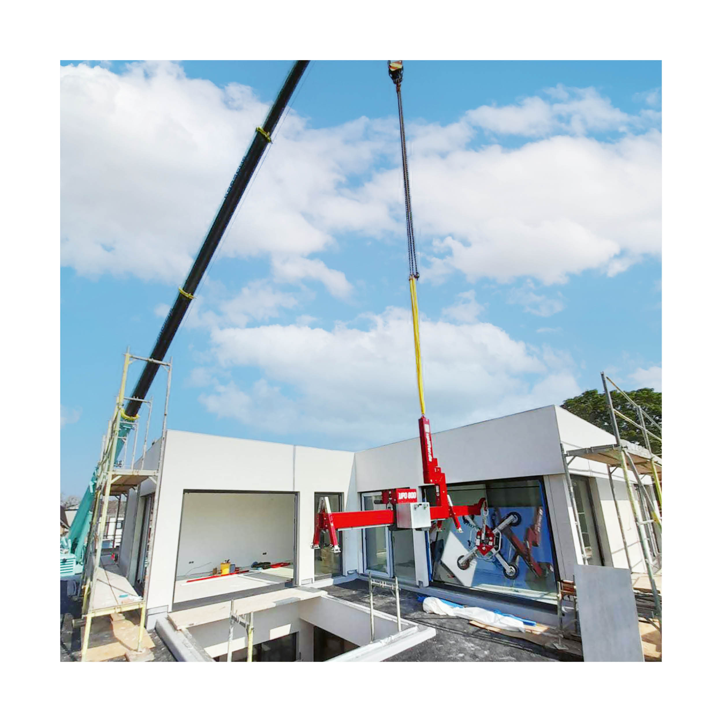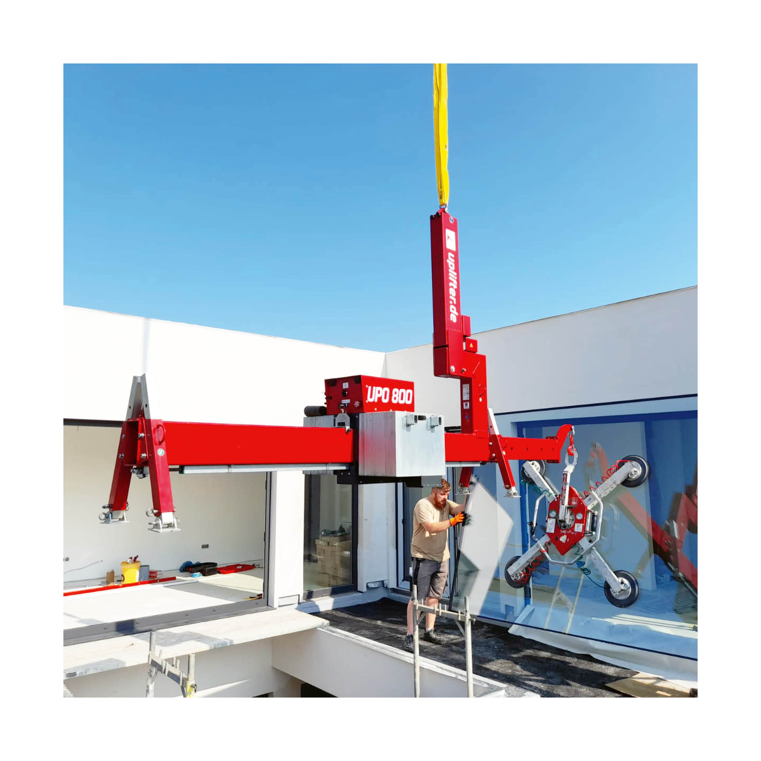 In Verbindung mit einem Mini-, Auto- oder Turmdrehkran dient die Überhangtraverse UPO800 zur Montage von Bauelementen in schwer zugänglichen Bereichen, z. B. unter einem Dachvorsprung, Balkon, Vordächern oder Nischen. Der benötigte Überhang ist in verschieden Stufen absteckbar. Mit der serienmäßigen Funkfernbedienung kann das Gegengewicht genau positioniert werden, um die gehobene Last auszubalancieren. Das Gegengewicht ist mit einzelnen Ballastplatten ausgestattet. So hat man die Möglichkeit, die Traverse so individuell wie möglich an die Gegebenheiten auf der Baustelle anzupassen. Möchten Sie dazu passende Glassauger kaufen oder einen Vakuum-Glasheber mieten, kontaktieren Sie uns für die richtige Auswahl.