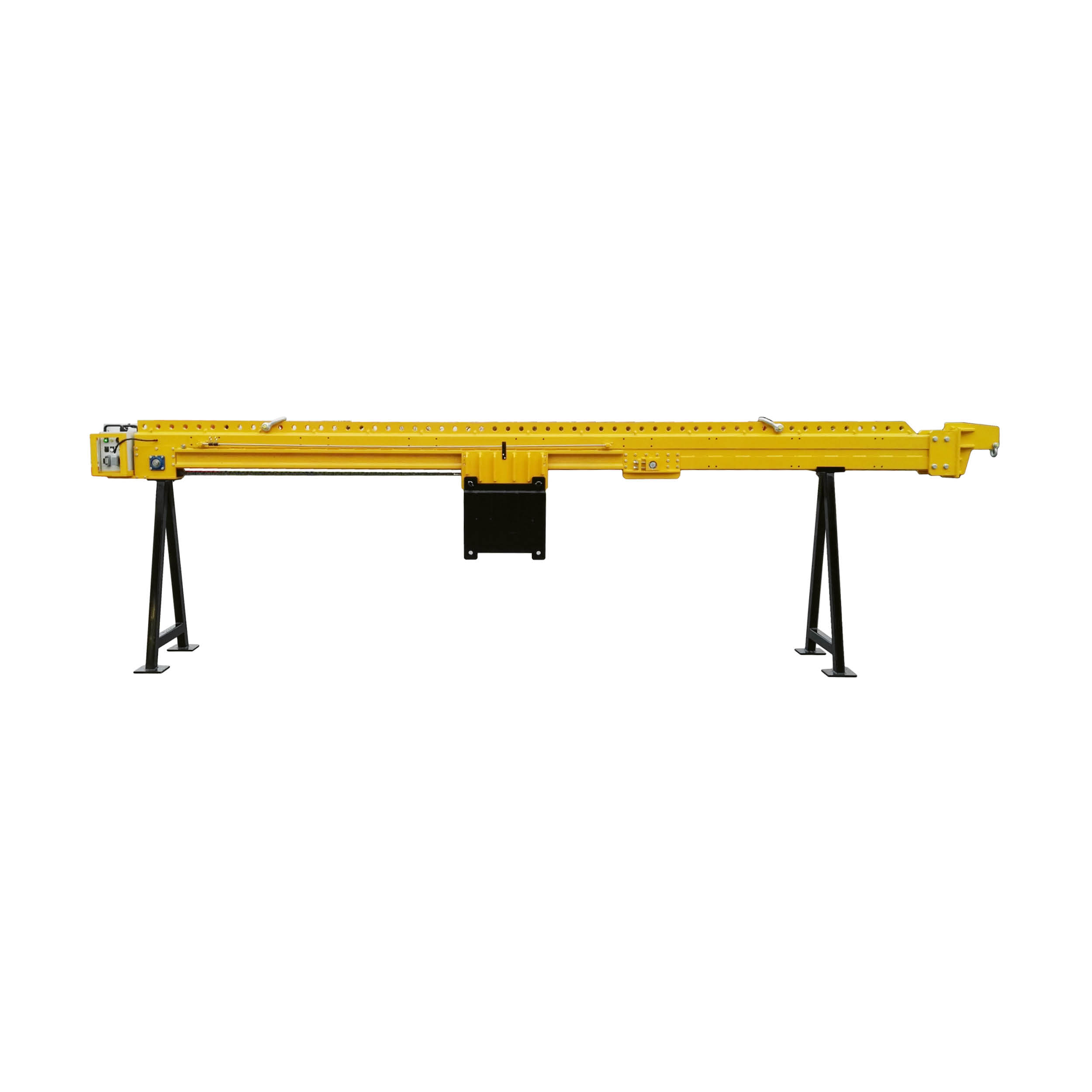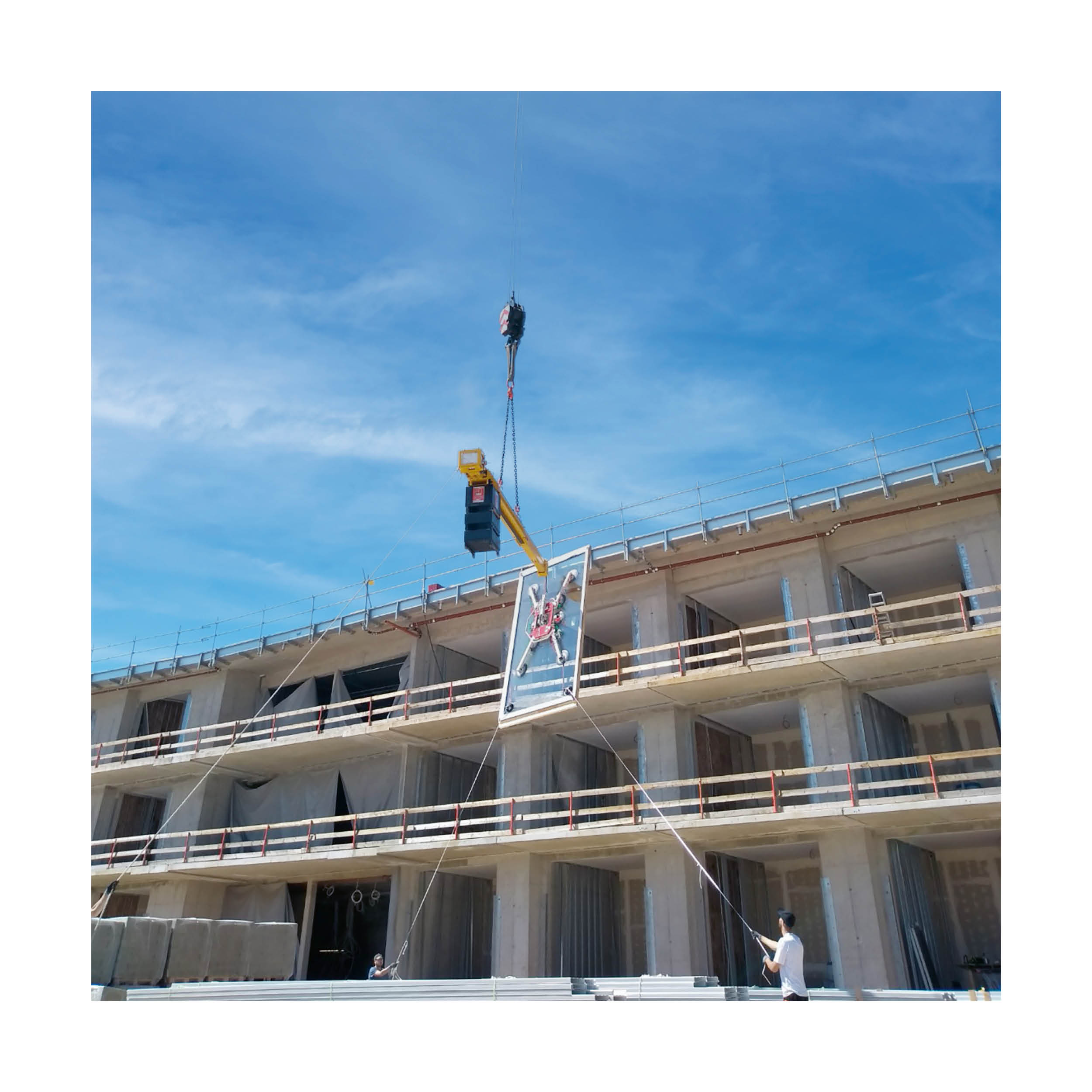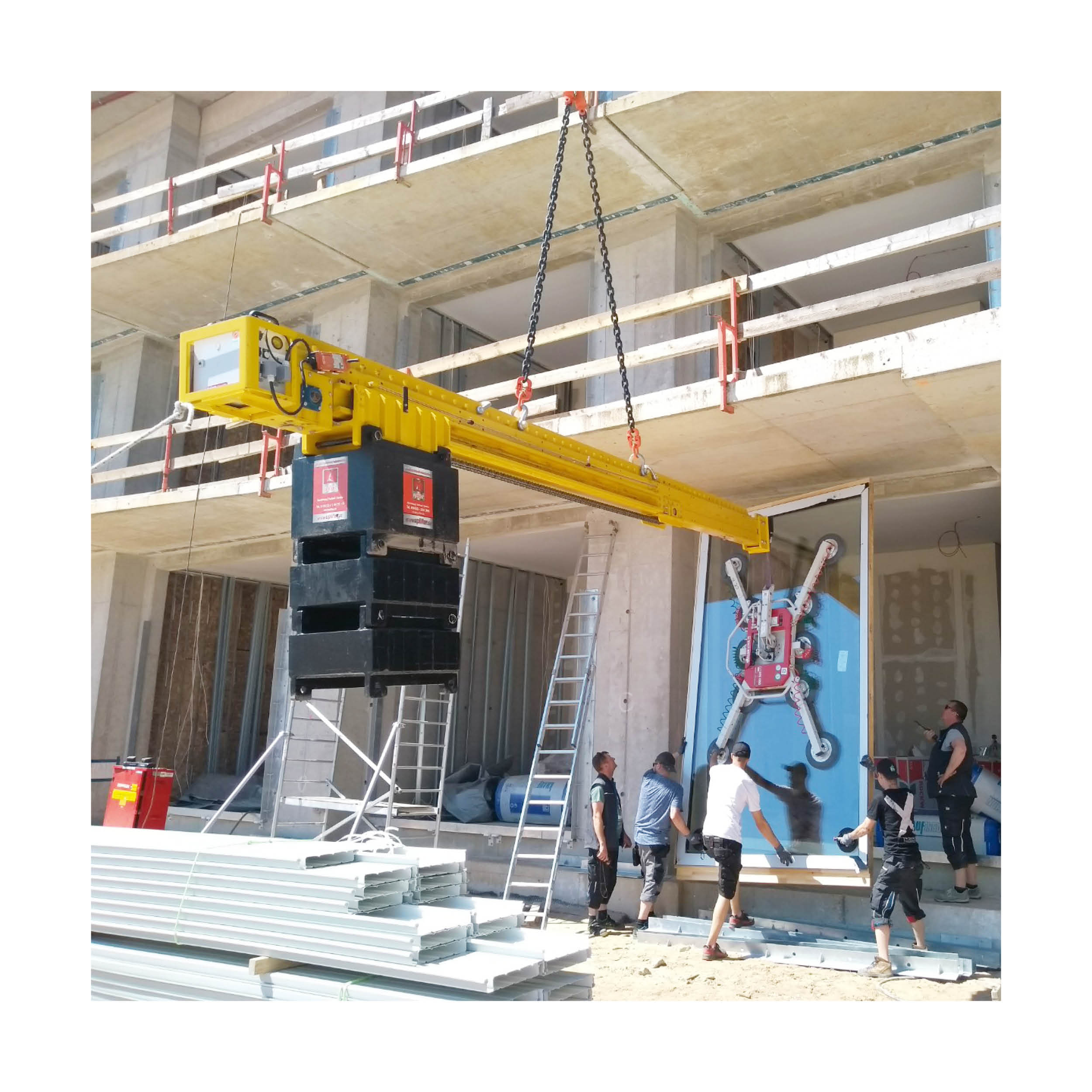 UPO3000 ist eine Kombination aus einem Tragrohr und verfahrbaren Kontergewichten mit Energieversorgung (Akku und Netz inkl. Ladegerät). An dem Tragrohr ist vorne eine Adapterplatte angebaut, die es ermöglicht, einen Vakuumlifter anzubauen. Die Überhangtraverse UPO3000 ist für den flexiblen Einsatz auf Baustellen, an verschiedenen Krananlagen gedacht, überall dort, wo kein 220/240 Volt Anschluss zur Verfügung steht. Mit einer Traglast von max. 3.000 kg können Sie auch schwere Scheiben sicher heben und positionieren. Die Bedienung der verfahrbaren Kontergewichte erfolgt über eine Funkfernbedienung. UPO3000 verfügt über eine 2-Strang-Anschlagkette, die variabel an das Tragrohr befestigt wird. An dem Tragrohr sind Adapterplatte, verfahrbare Kontergewichte mit Getriebemotor, Batterieladegerät und Batterien angebaut. Der Spannungsanzeiger informiert den Benutzer über den aktuellen Batterieladezustand. Die Ladekreisspannung für das Ladegerät beträgt 220-240 Volt AC (50/60 Hz). Die Batterien sind wartungsfrei und verschlossen, sie sind tiefenentladungssicher. Durch die optionale Verlängerung kann man den Überhang zusätzlich um weitere 1,89 m erhöhen.