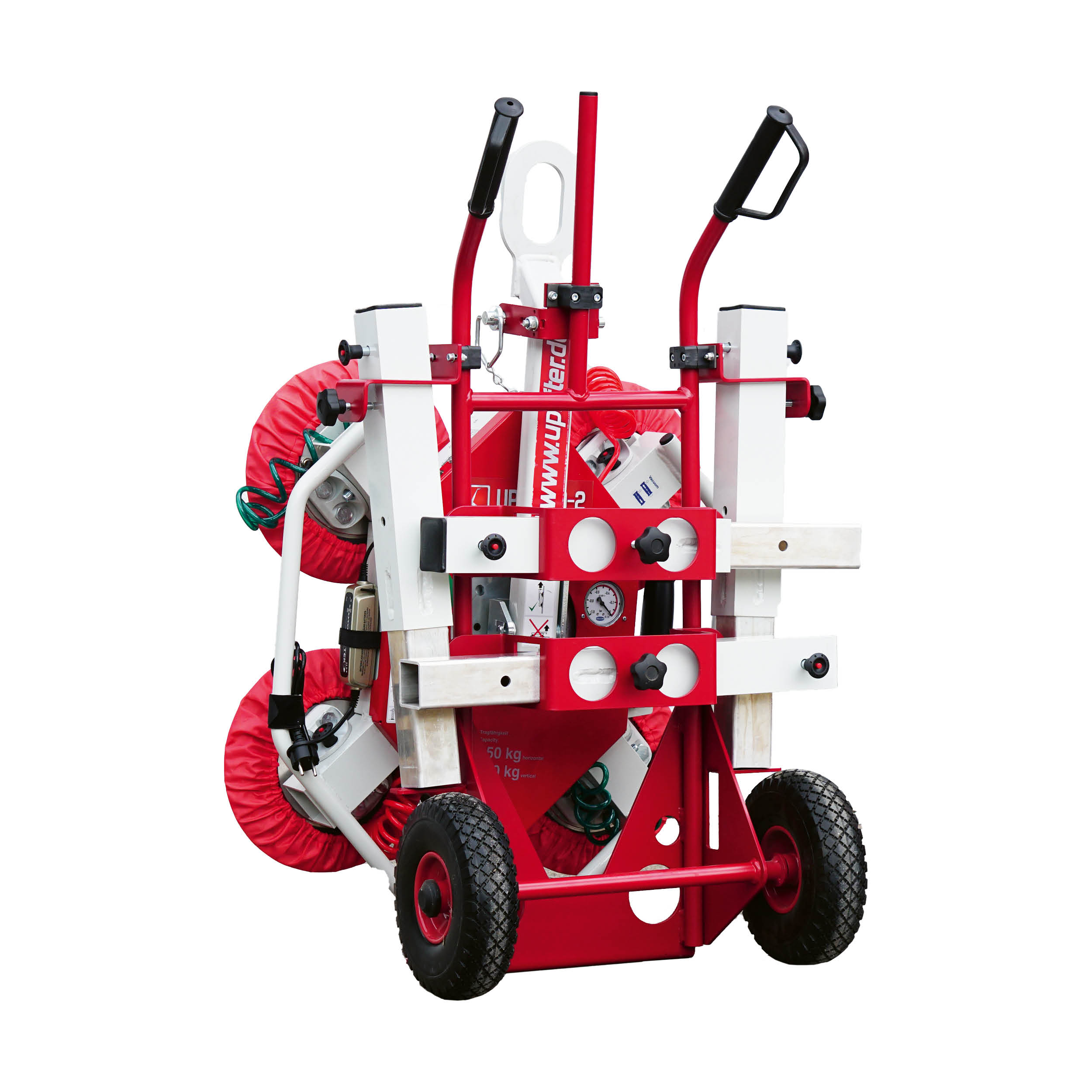 Leichtes Handling der Vakuumsauger auf der Baustelle und zur sicheren Aufbewahrung. Durch Sicherungsbolzen fest mit dem Transportwagen verbunden.